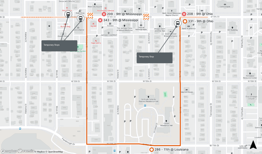 Southbound Route 3 heading Westbound on 9th will take a right on Mississippi St., left on 11th St., left on Ohio St., a right on 9th St. and back on its regular route. Stop #343-9th & Mississippi will be closed. A temporary stop will be placed on 9th St. near Mississippi (by Cork & Barrel).